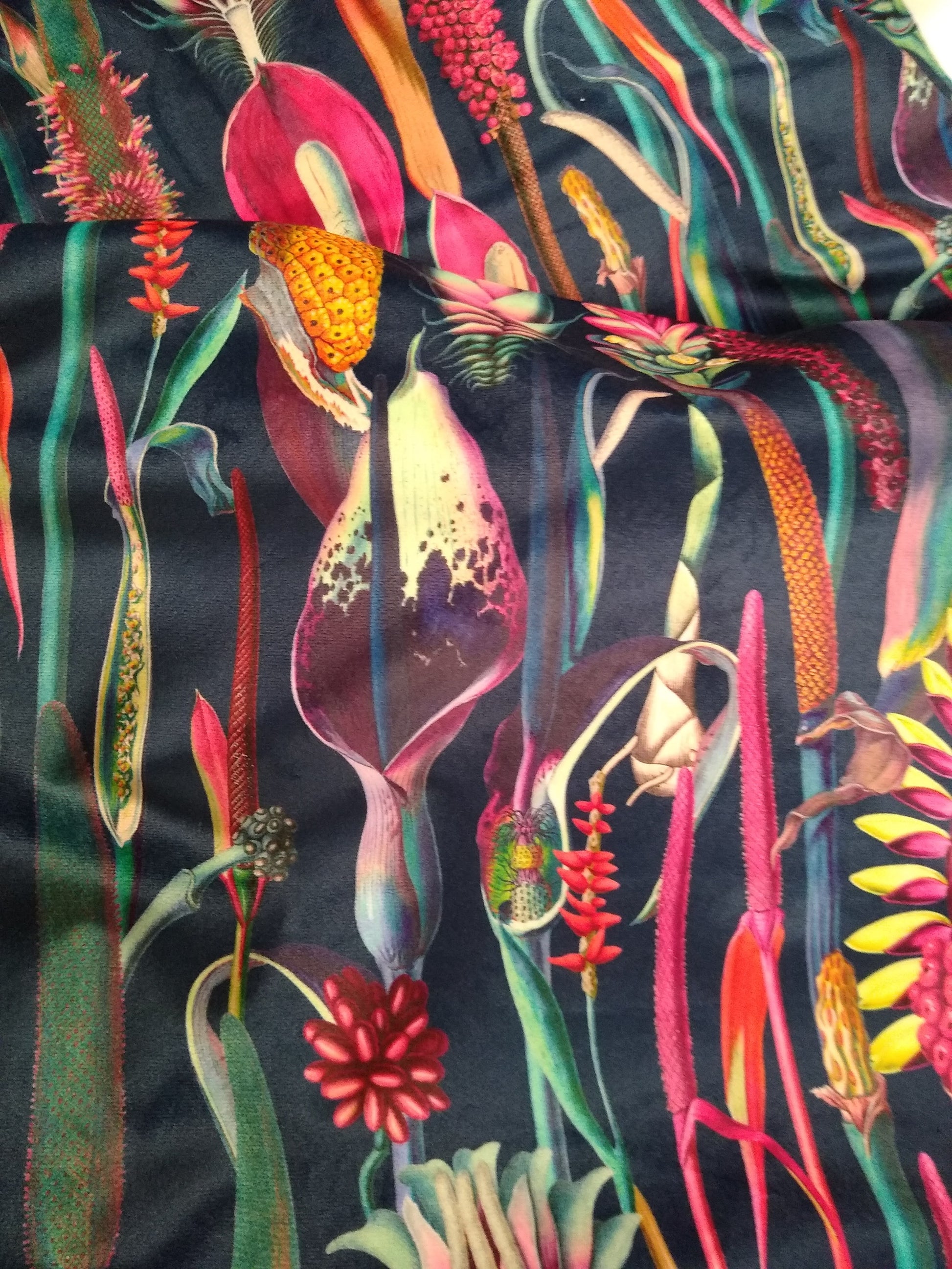 Absolutely stunning genuine LLoyd Loom chair (label Inside). Painted in a waterproof paint colour Byzantine, a rich dark green/blue. The sprung seat has been recovered in a rich multi coloured digital printed velvet which compliments the paint shade. The cushion is supplied with the chair.